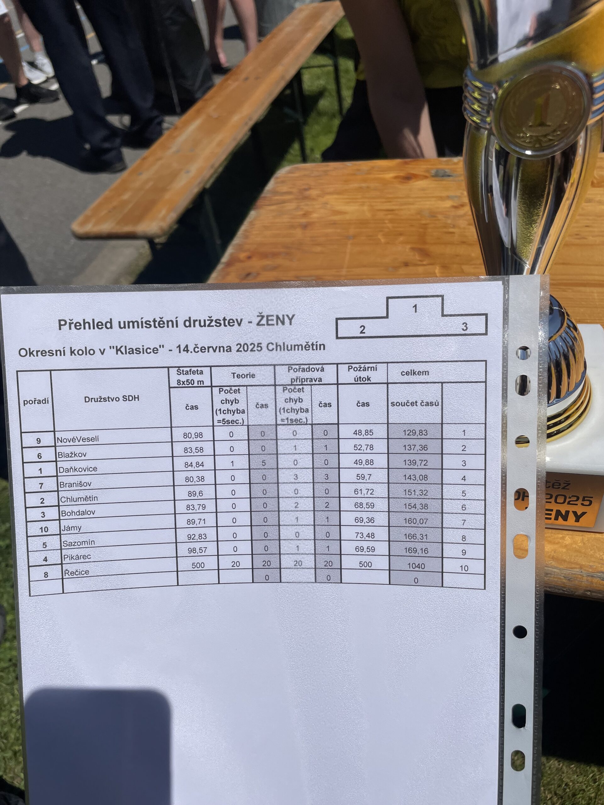 Při čekání na výsledky se v Chlumětíně dobře občerstvily chutným jídlem a pitím. Soutěž byla velmi dobře nachystaná a všichni pořadatelé byli moc milí. Z vyhlášení si ženy odnesly velký pohár a krásné spokojené úsměvy. Holkám se tvrdé tréninky vyplatily a již druhým rokem potvrdily své kvality a obhájily okresní vítězství.