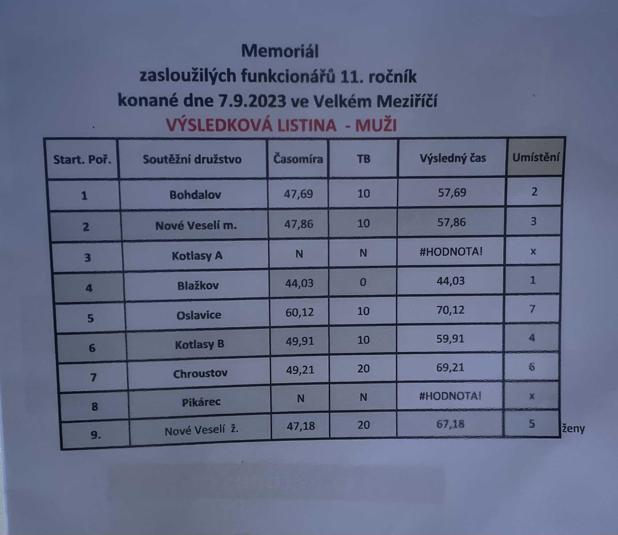 V poledních hodinách družstva dorazila do Velkého Meziříčí na Memoriál zasloužilých funkcionářů. Jako první odběhly ženy. Naše družstvo si doběhlo pro krásným čas 47,18 s. Vysloužilo si však 20 trestných bodů a hlavní rozhodčí družstvo přeřadil do kategorie mužů. Ženy se i přes tyto komplikace umístily na krásném 5. místě v mužské kategorii.